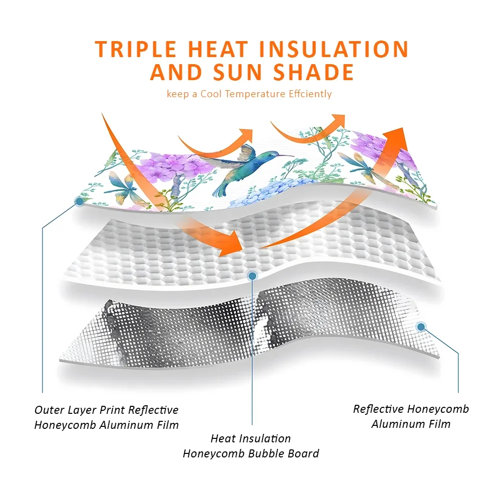 High-quality heat-insulating aluminum film material, strong heat insulation, sun protection and heat preservation, adsorbed on the car glass through suction cups, environmentally friendly digital inkjet printing process, the pigment directly penetrates into the fabric, and has the characteristics of water resistance and non-fading
